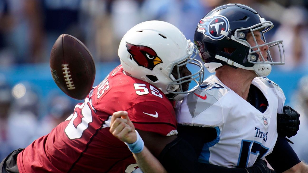 Jones’ third sack of the game gave him 100 for his career. He became the eighth player since the NFL began tracking sacks to reach triple digits in career sacks in the first 125 games of his career, according to ESPN Stats & Information research. The only other active players to reach that mark are Jones’ teammate J.J. Watt and Denver’s Von Miller. With Jones and Watt both having reached 100 sacks for their career, the Cardinals are the first team since 1999 to feature two 100-sack players.