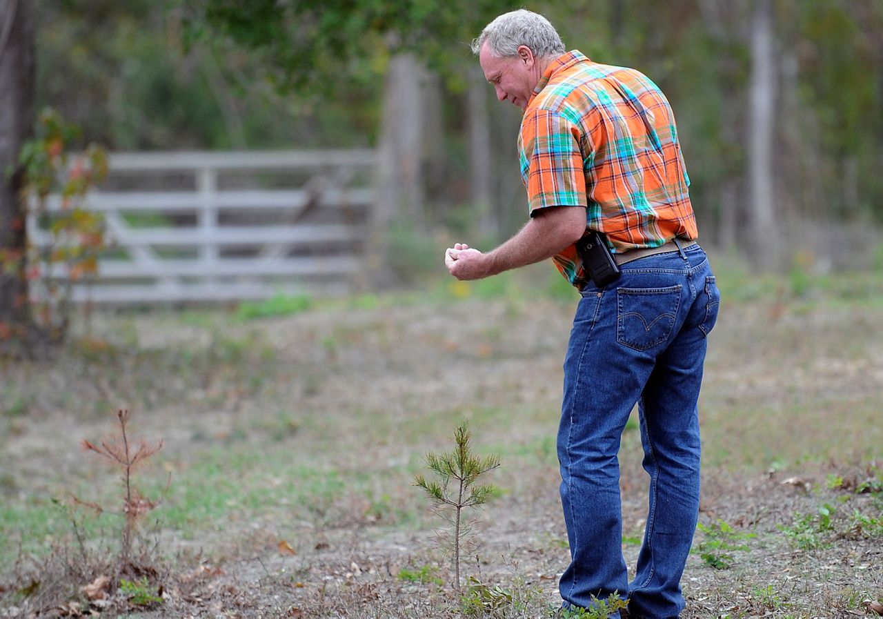 In this photo taken Nov. 8, 2011, David Barfield checks one of his saplings at his Christmas tree farm in New Caney, Texas. Only a handful of the 500 saplings planted survived the drought. (AP Photo/Pat Sullivan)