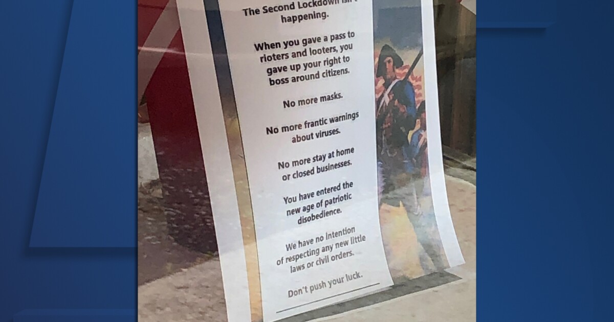 The sign, which said “The second lockdown isn’t happening,” and warned “when you gave a pass to rioters and looters, you gave up your right to boss around citizens,” also called for “no more masks, no more frantic warnings about viruses,” and “no more stay at home or closed businesses,” before going on to say “we have no intentions of respecting any new little laws or civil orders.”